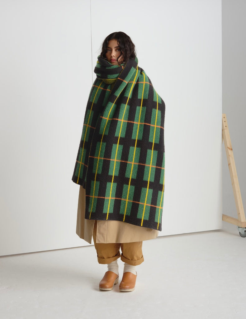 Jo's version of tartan, a huge, luxurious, and cosy scarf made from the softest brushed lambswool. Can be worn draped over the shoulders for dramatic effect or wrapped round to keep cosy. On a cold winter’s night, it is perfect for snuggling on the sofa or even in bed. Throw over your furniture for some interior pattern.