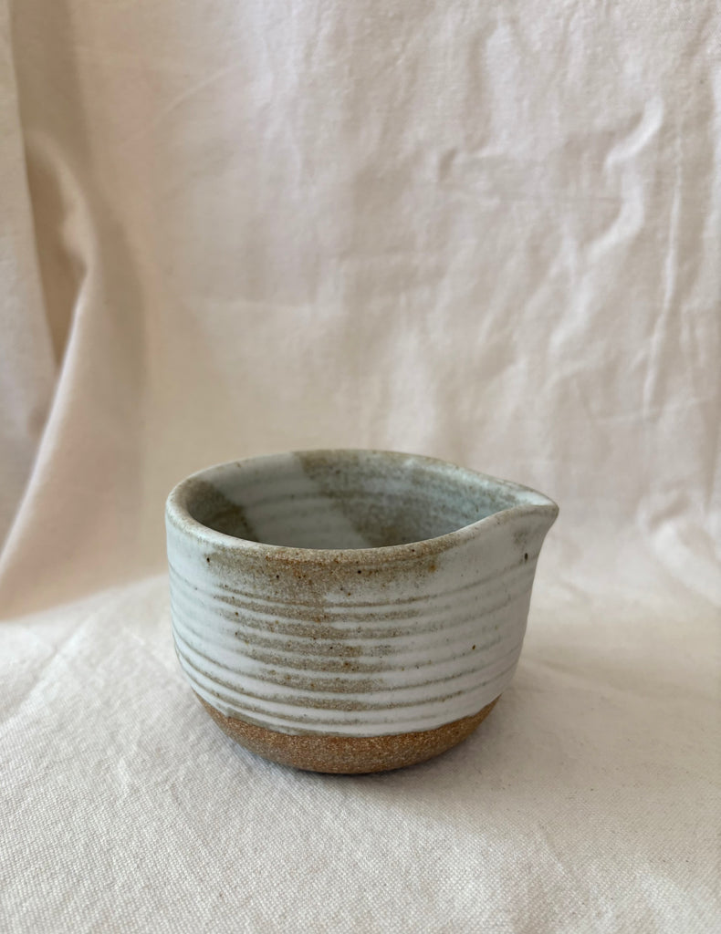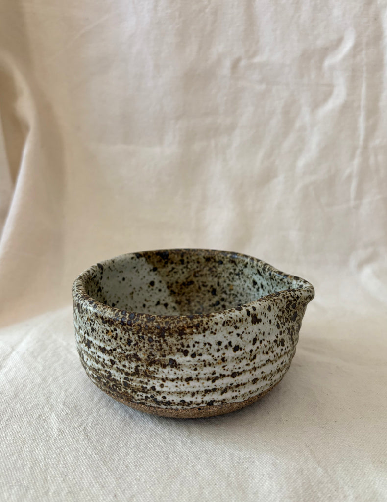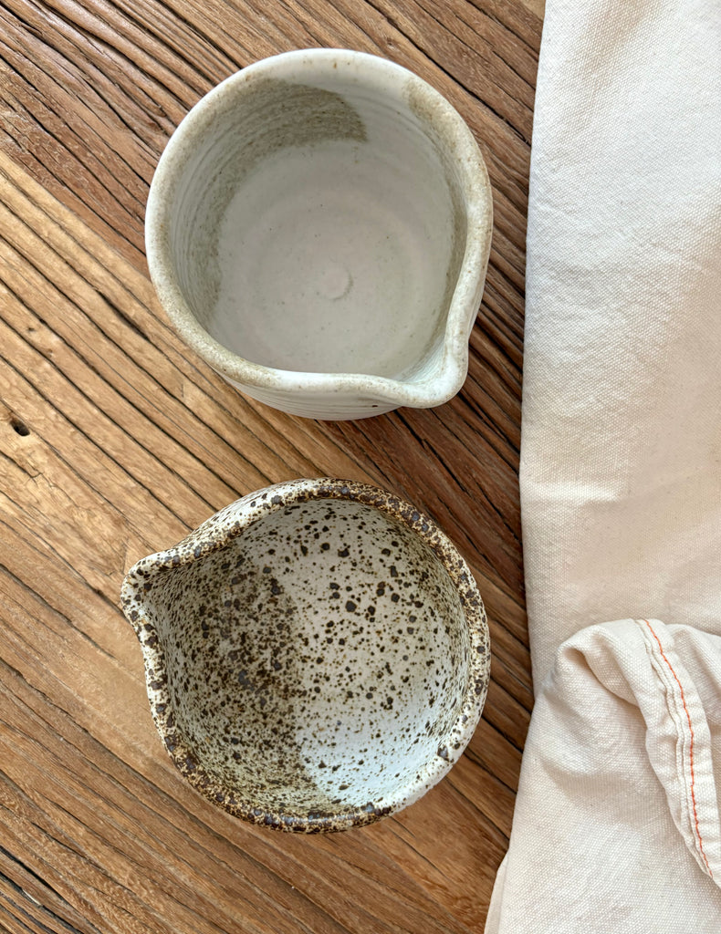 This small spouted bowl is perfect for pouring cream or a salad dressing. We're offering it Colleen's classic matte white/grey and then a more densely speckled matte version. Each piece is uniques and sizes will vary a bit.