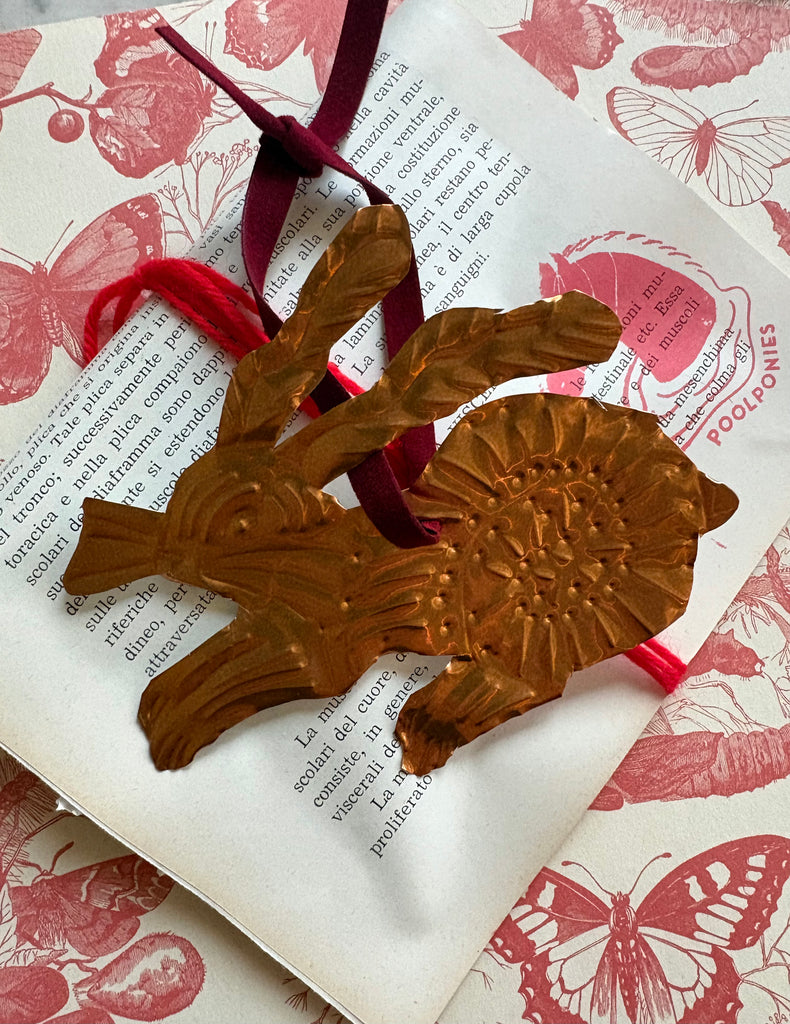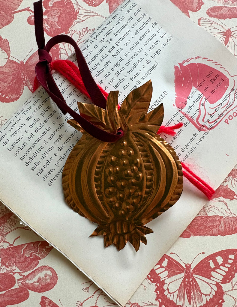 Delicate ornaments by Italian artist Maria Cecilia Azzali. Each is hand-embossed in anodized aluminum and tied with a velvet ribbon. Each is one-of-a-kind and will come wrapped in an envelope made of vintage Italian book leaves. These are really special and rather poetic.