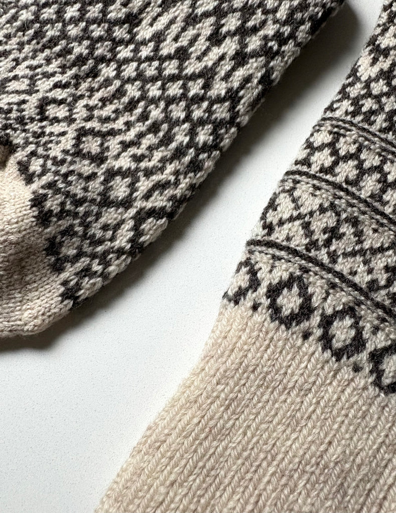 The wool selected for these socks was chosen for it's plushness and similarity to pile texture. Softness and warmth to envelop your feet. Woven in a Japanese mill lauded for their textile/craft/ sock making know-how. Treat these right and they'll serve you a long time. A classic pattern in wintry, neutral tones. Length: crew