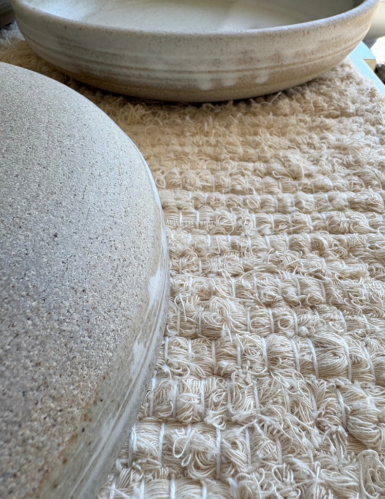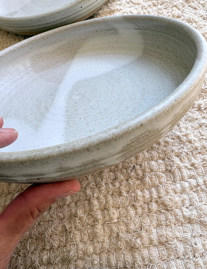 construction: stone-ware with a matte oat glaze with a swath of foggy white.
