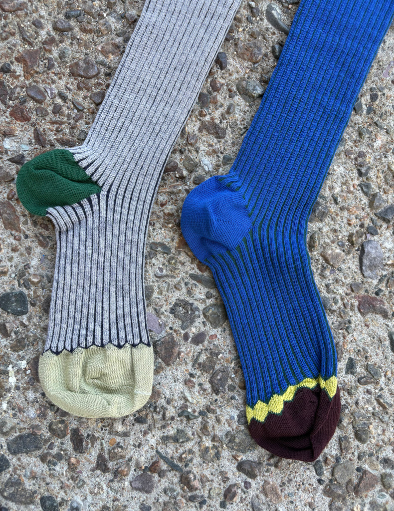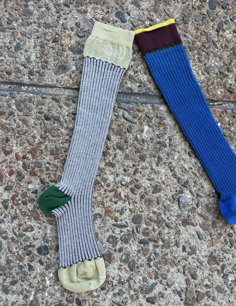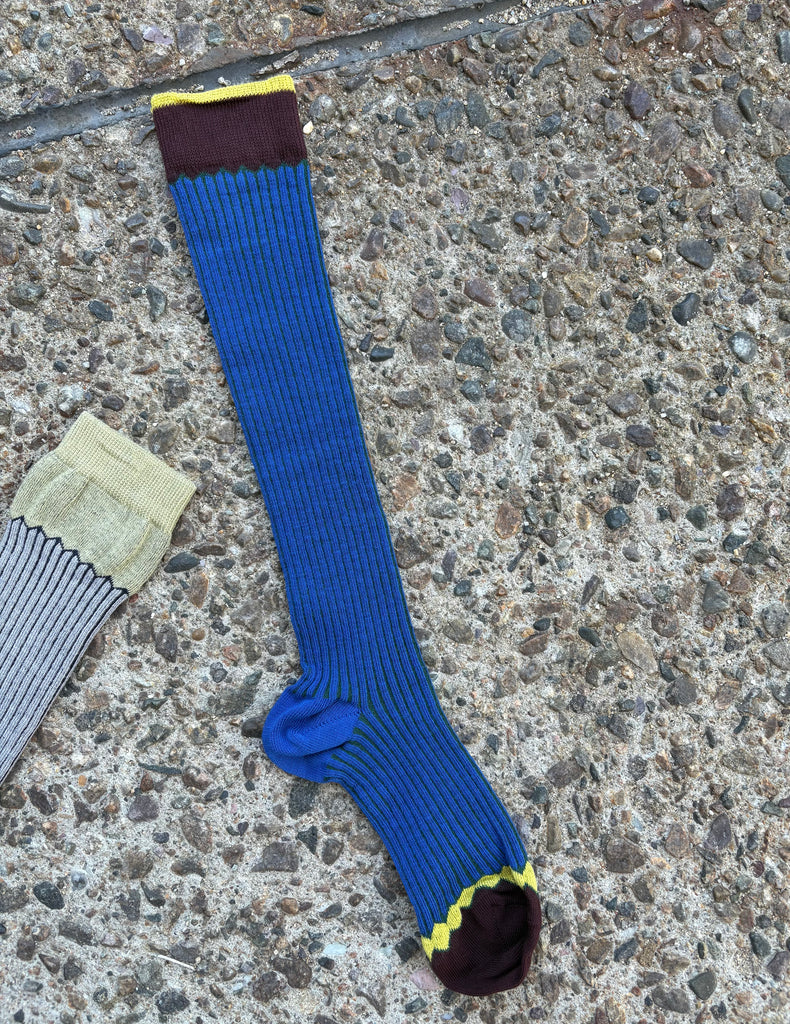 Cotton/mix socks featuring a stretchy rib with alternating fine knit detail. Contrasting hues are handsomely paired. Comfortable wide, ribbed band at the top. Knee length.