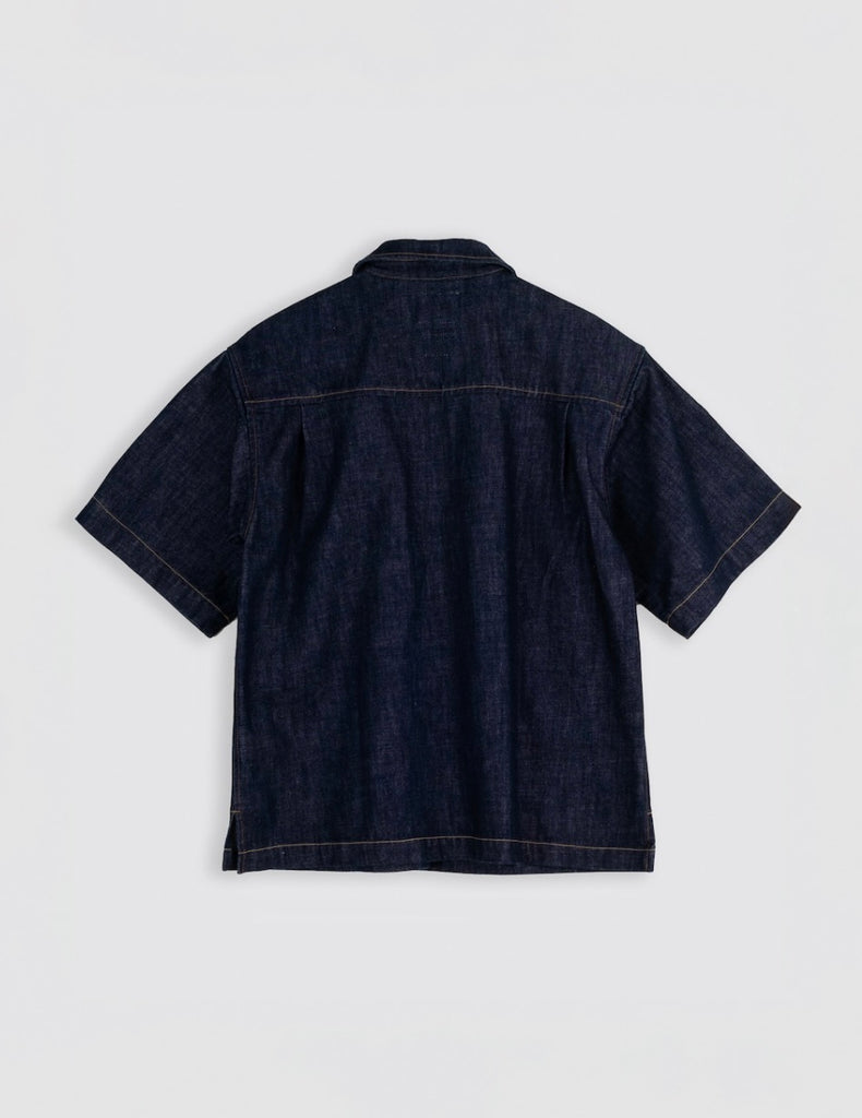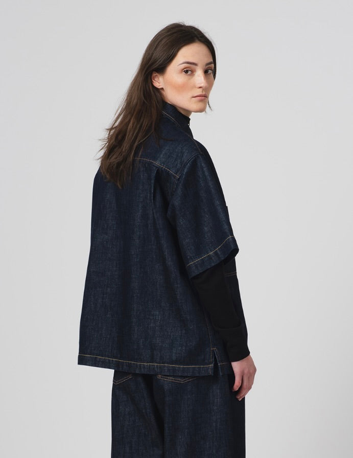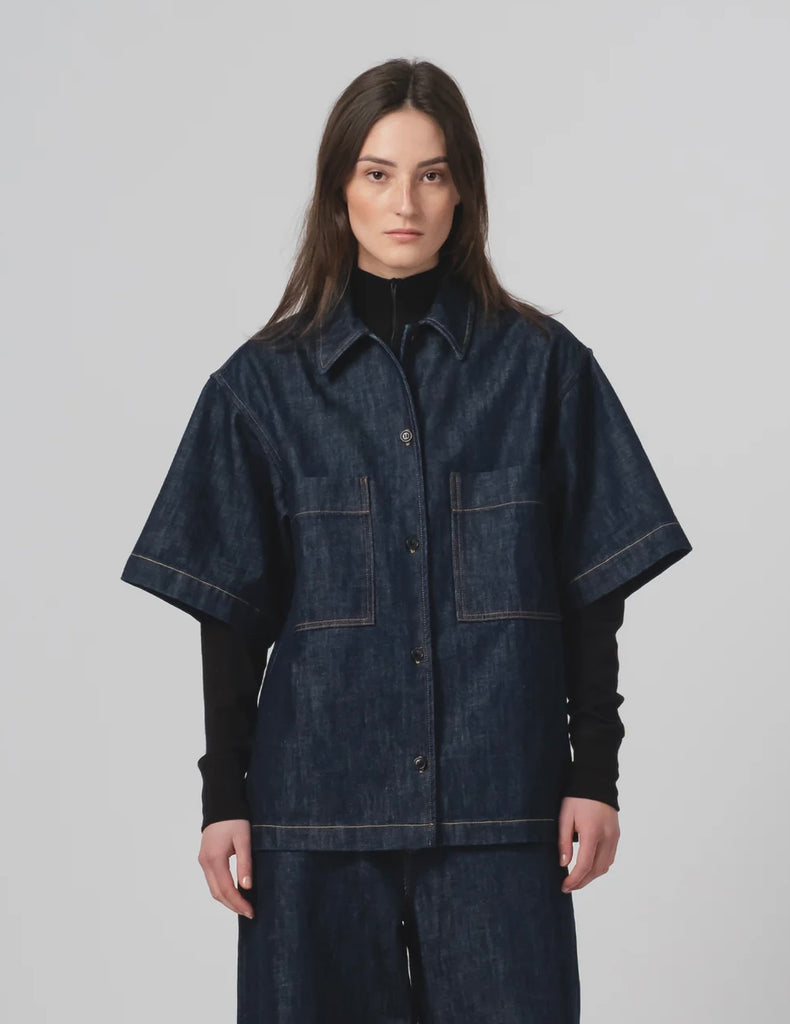 A versatile overshirt in Century denim blue. Combines a comfortable relaxed fit with everyday ease. Designed with two chest pockets for added functionality, it features short sleeves, Corozo button fastening at front, and split seam at the hem— perfect for layering over your favorite tee or sweater. Unisex fit.