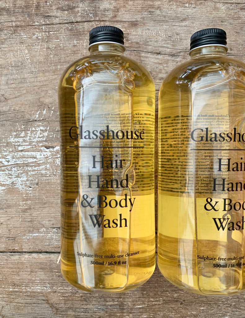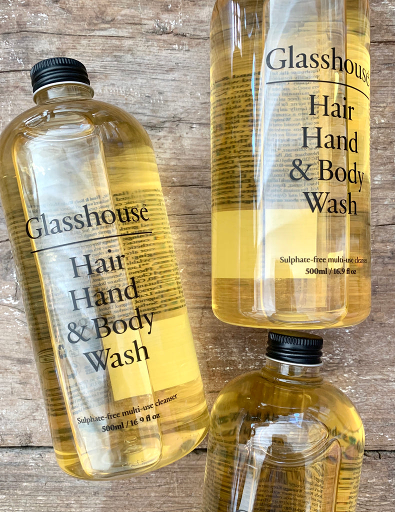 Glasshouse Hair, Hand & Body Wash is a multi-purpose cleanser specifically formulated with a pH balance to nourish skin and hair equally. Organic extracts of chamomile, comfrey and aloe vera soothe and hydrate, while natural wheat protein revives weak hair and maintains condition. Sulphate-free, rich in vitamin B5 and with a 100% natural citrus and ginger scent that leaves skin, hair and hands fresh.