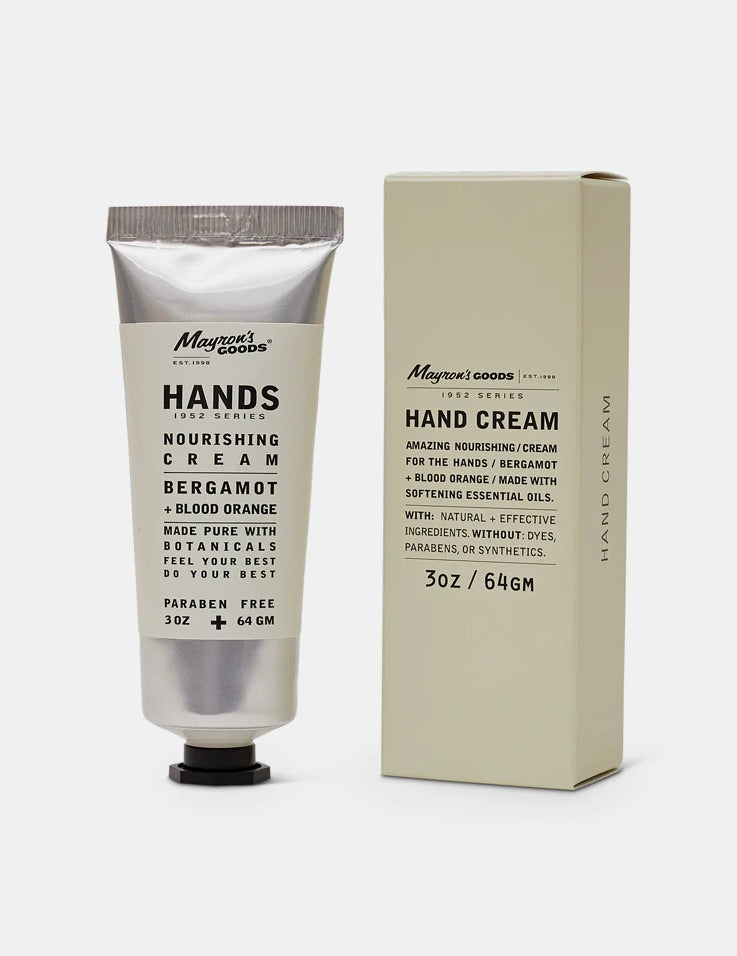 Mayron's hand cream has a wonderfully subtle Blood Orange and Bergamot scent with a base of shea butter and beeswax. Added benefits are botanical extracts like calendula, chamomile, rosemary, and essential oils of Sunflower and Avocado, and Vitamin E to rejuvenate the skin.