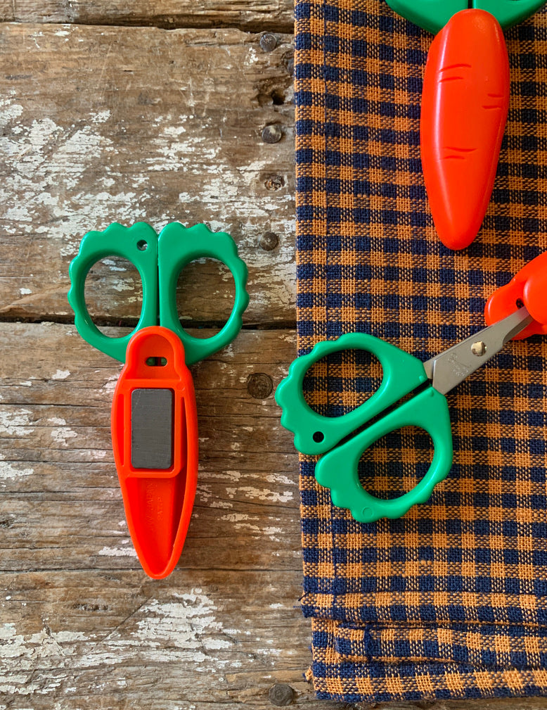 One of the handiest things you could have in the kitchen, and THE handiest thing you could stick on your fridge. Carrot magnet with little scissors inside. Perfect for all those little snips you make in the kitchen - and as they live on the fridge you always know where they are.