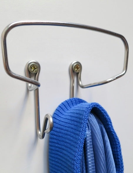 Stainless steel wire wall hook, incorporating two lower loop hooks and a generous upper swoop to support more delicate garments.