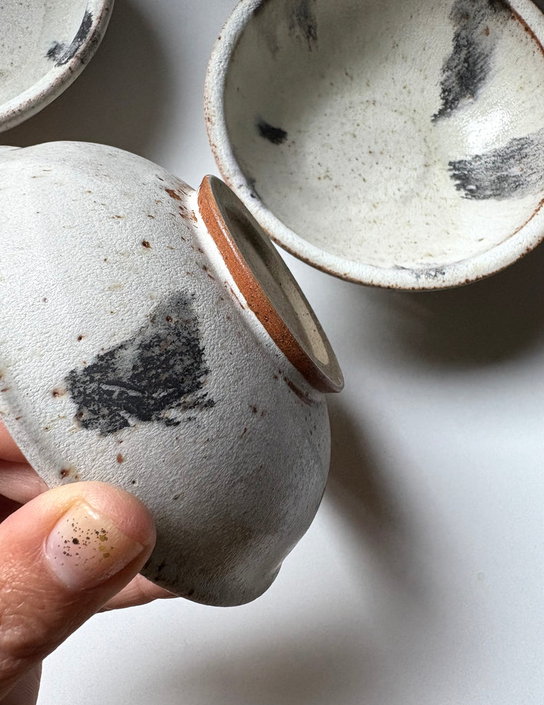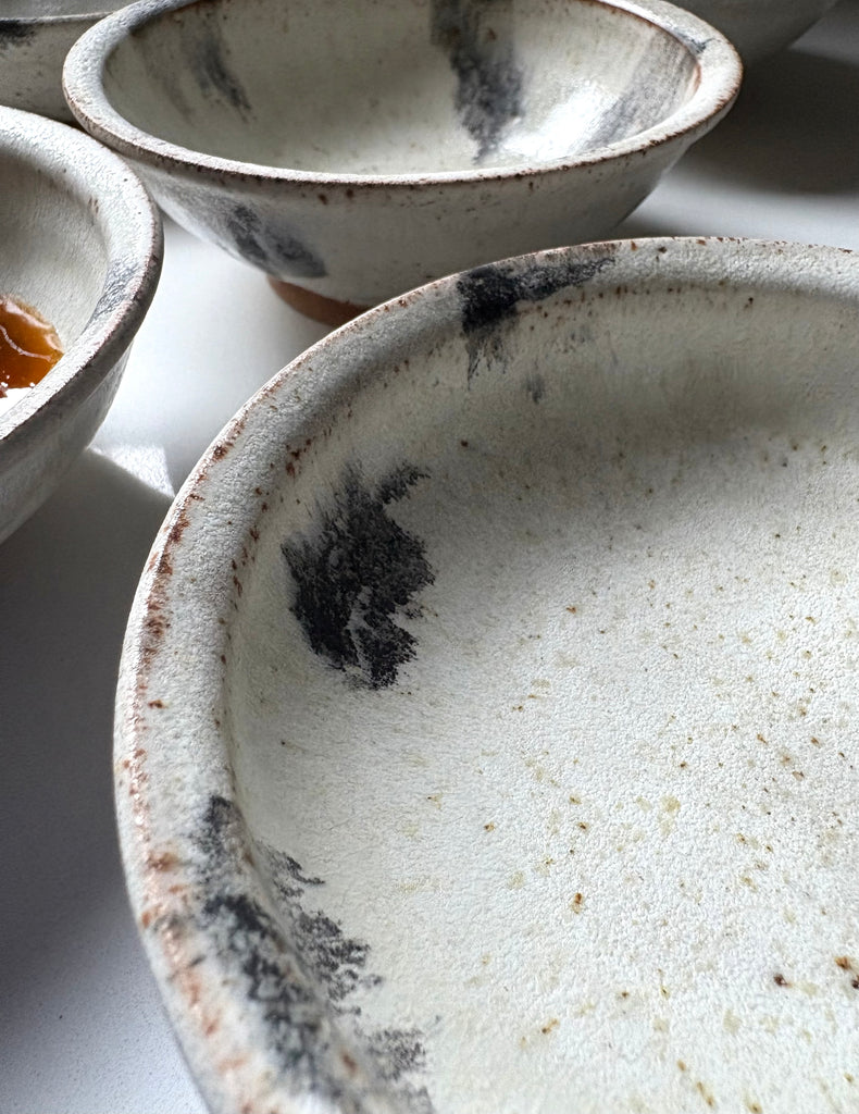 Tiny and mighty footed bowl featuring a slight rim and random 'blotches' of black glaze. You'll be reaching for this one often. Perfect for dips, jams, olives, your tinier portion of ice cream because you refuse to give that up and we don't blame you!