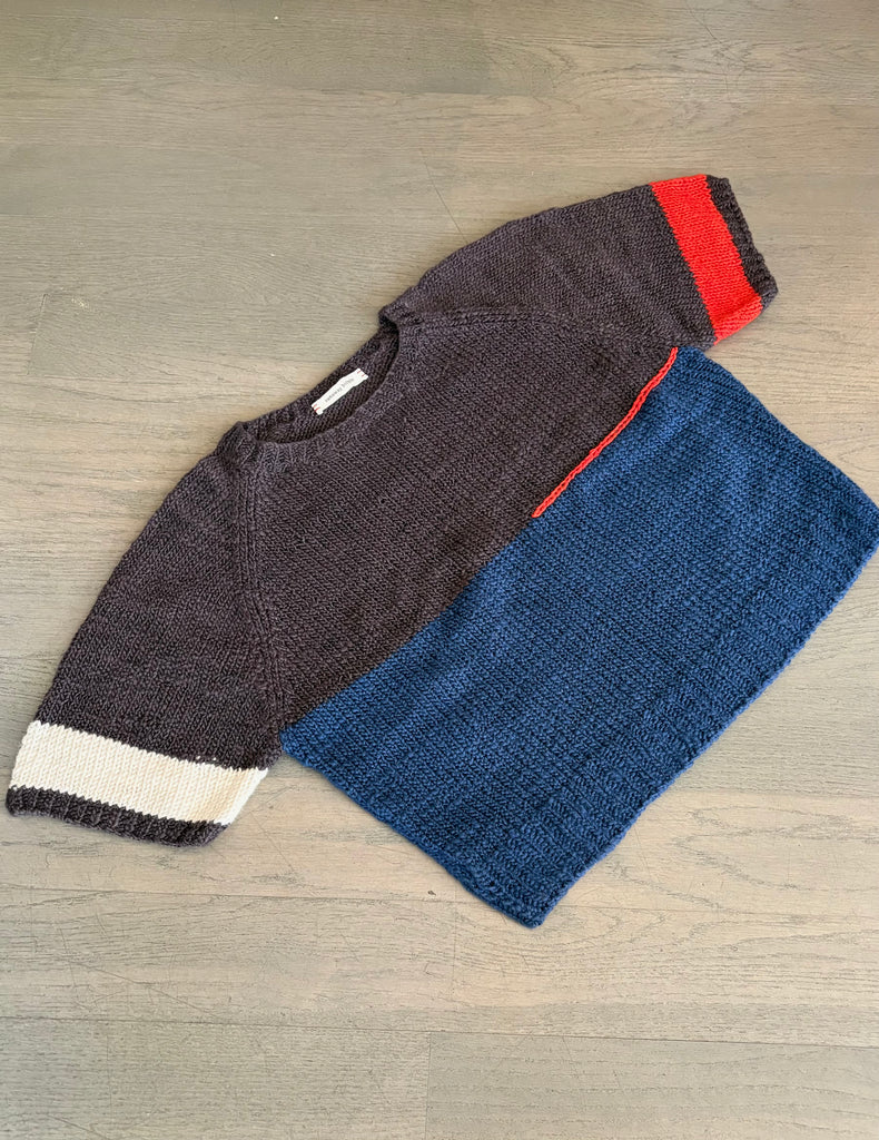 A completely hand-knit pullover featuring a modern, color block design. The handloom merino/silk yarn is super soft and you can expect periodic neps, or bumps throughout the top. Cropped fit with raglan short sleeves. A note on color: red, ivory, indigo, and a plumy-y brown. We'll let you name that. Offered in one size.